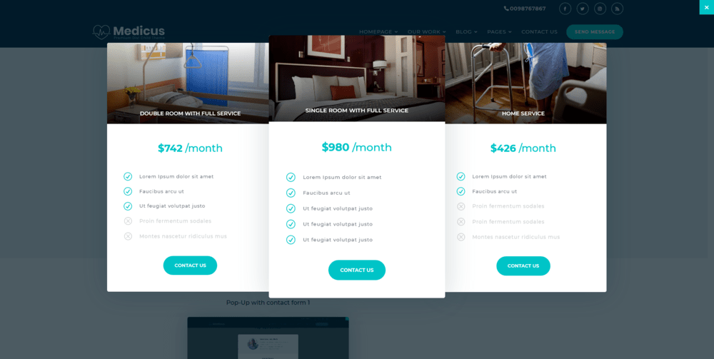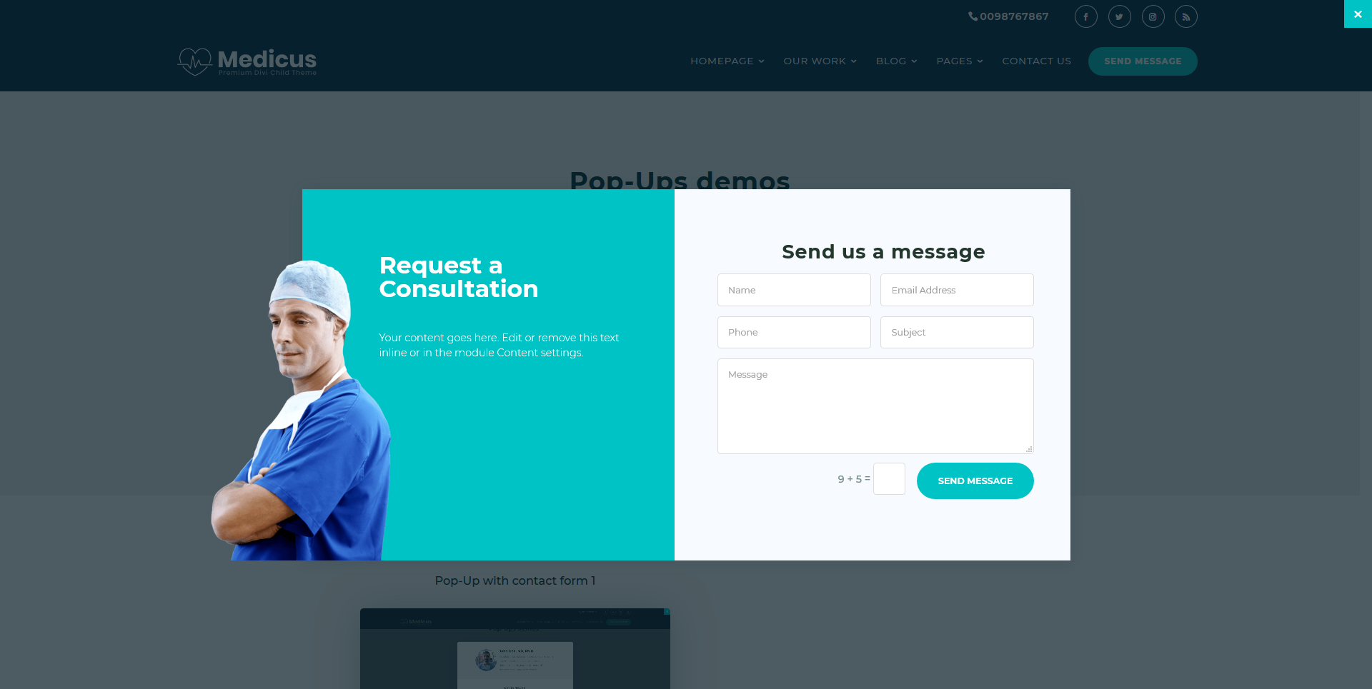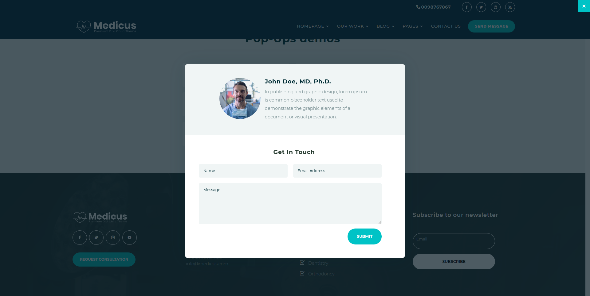 Pop-Ups demos Pop-Up with contact form 1 Pop-Up with contact form 2 Pop-Up with contact form 3 Single doctor Pop-Up Pricing packages Pop-Up